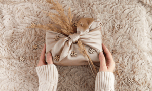 - Option 2 : Le Furoshiki (emballage en tissu). Optez pour des chutes de tissus, des foulards ou du papier cadeau en tissu (méthode japonaise du Furoshiki). C’est élégant, réutilisable à l’infini et fait partie intégrante du cadeau !