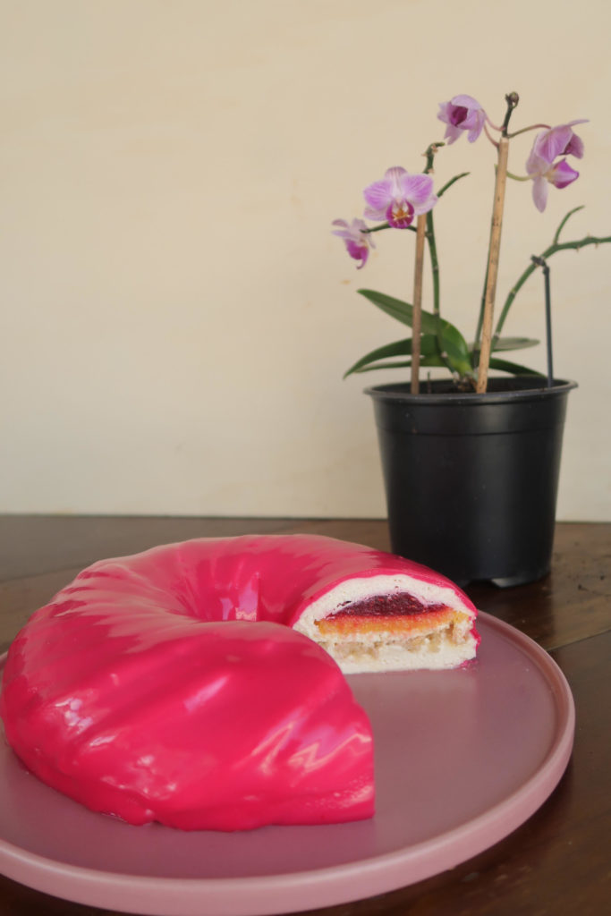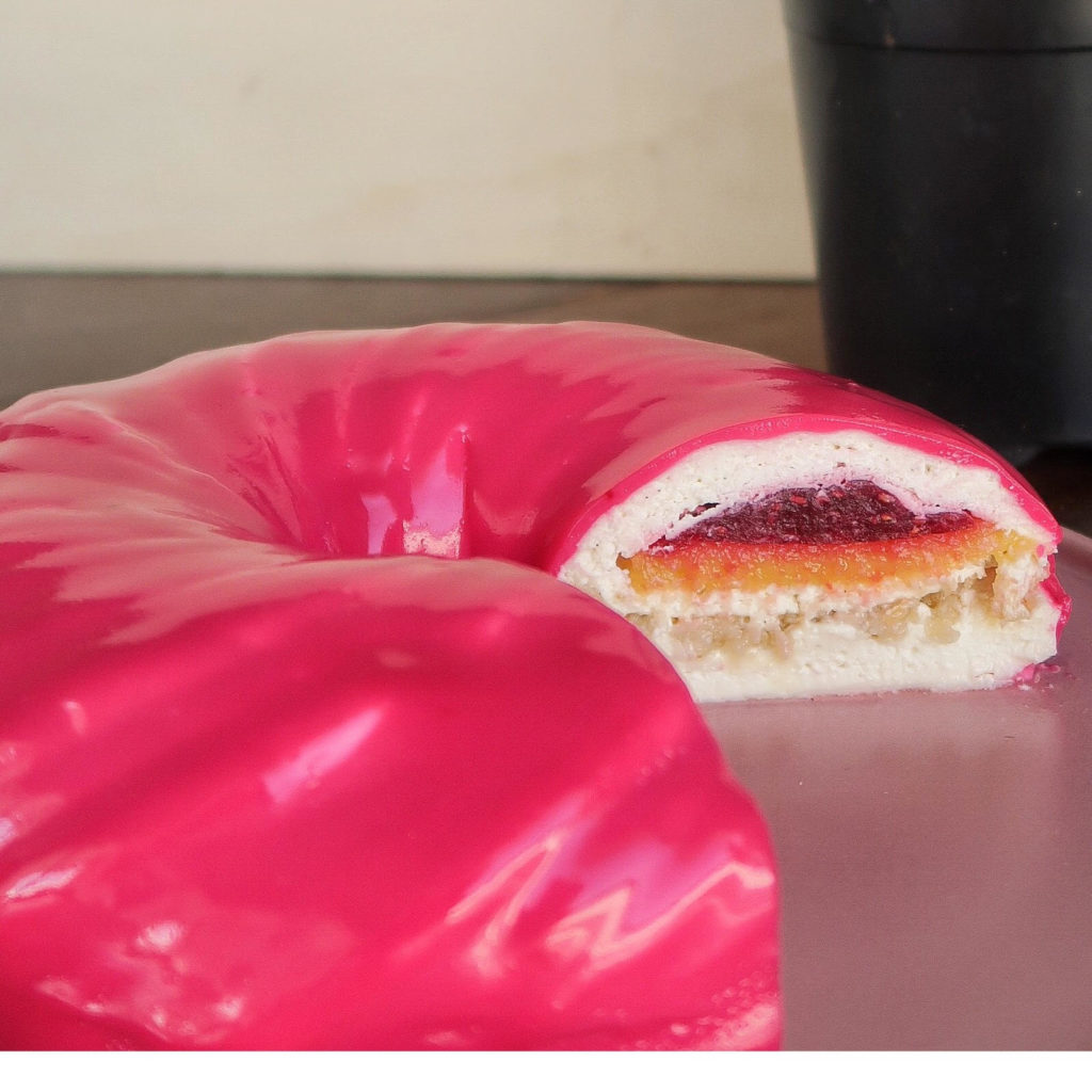 Démoulez l’insert gelée framboise + crémeux citron et gardez le au congélateur sur une assiette. Déposez la moitié de la mousse vanille dans le moule, placez l’insert congelé, la dacquoise refroidie et déposez le reste de la mousse.