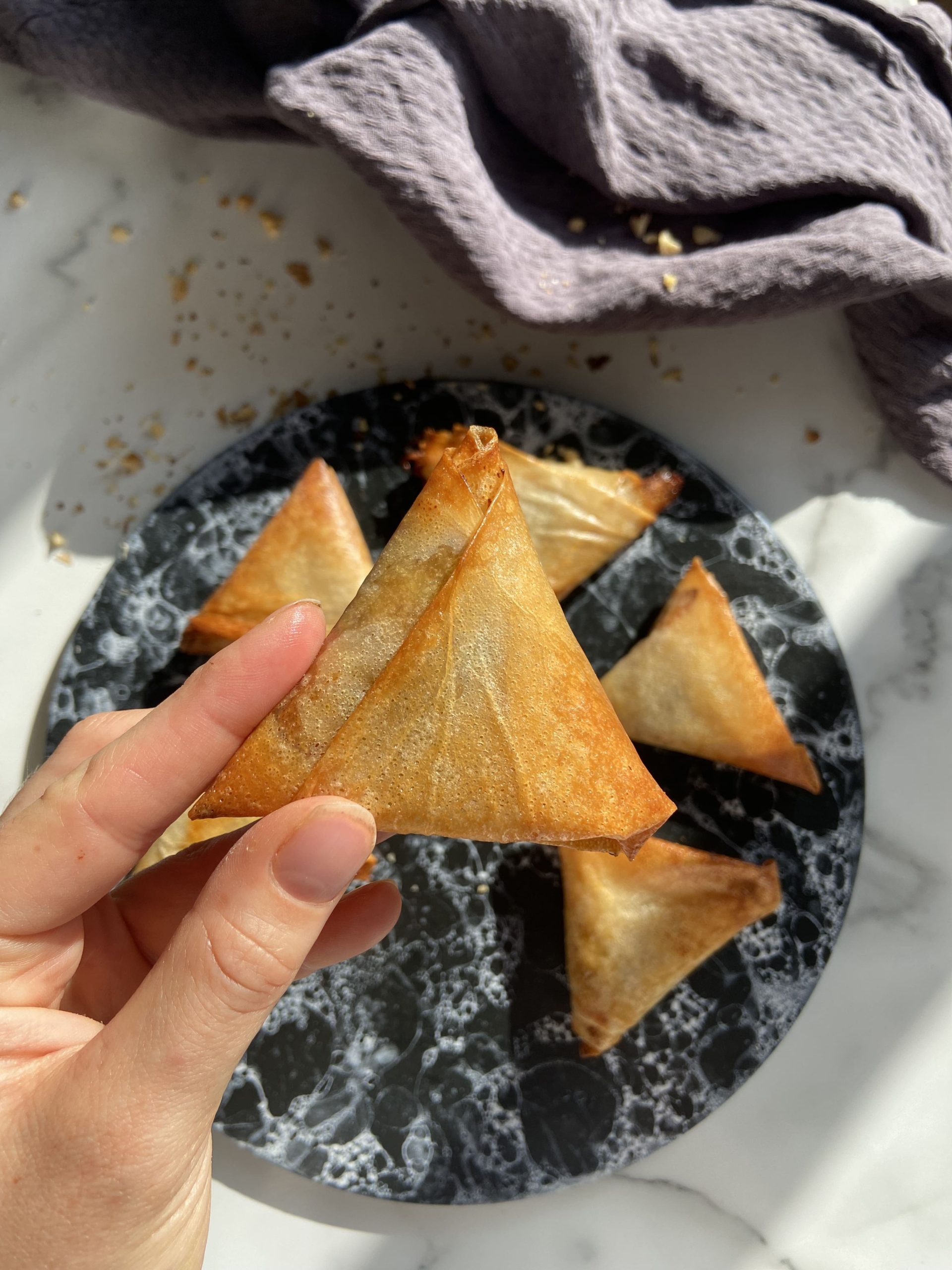 Ces samoussas font toujours leur petit effet : la courge sucrée, les noix croquantes et le gorgonzola qui relève tout ça… un trio parfait pour l’apéro !