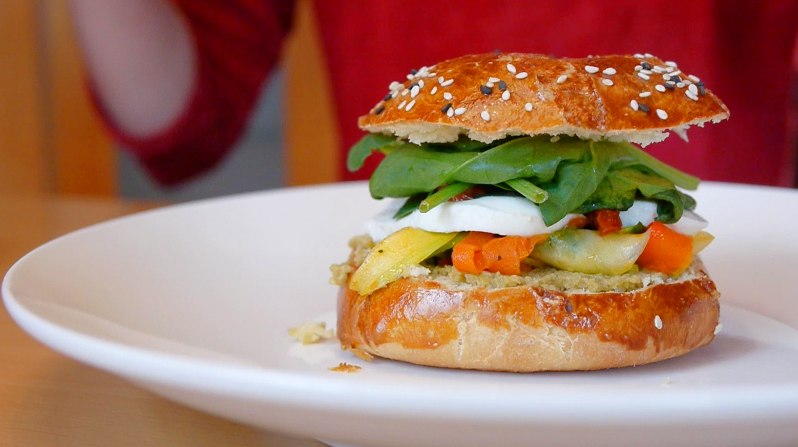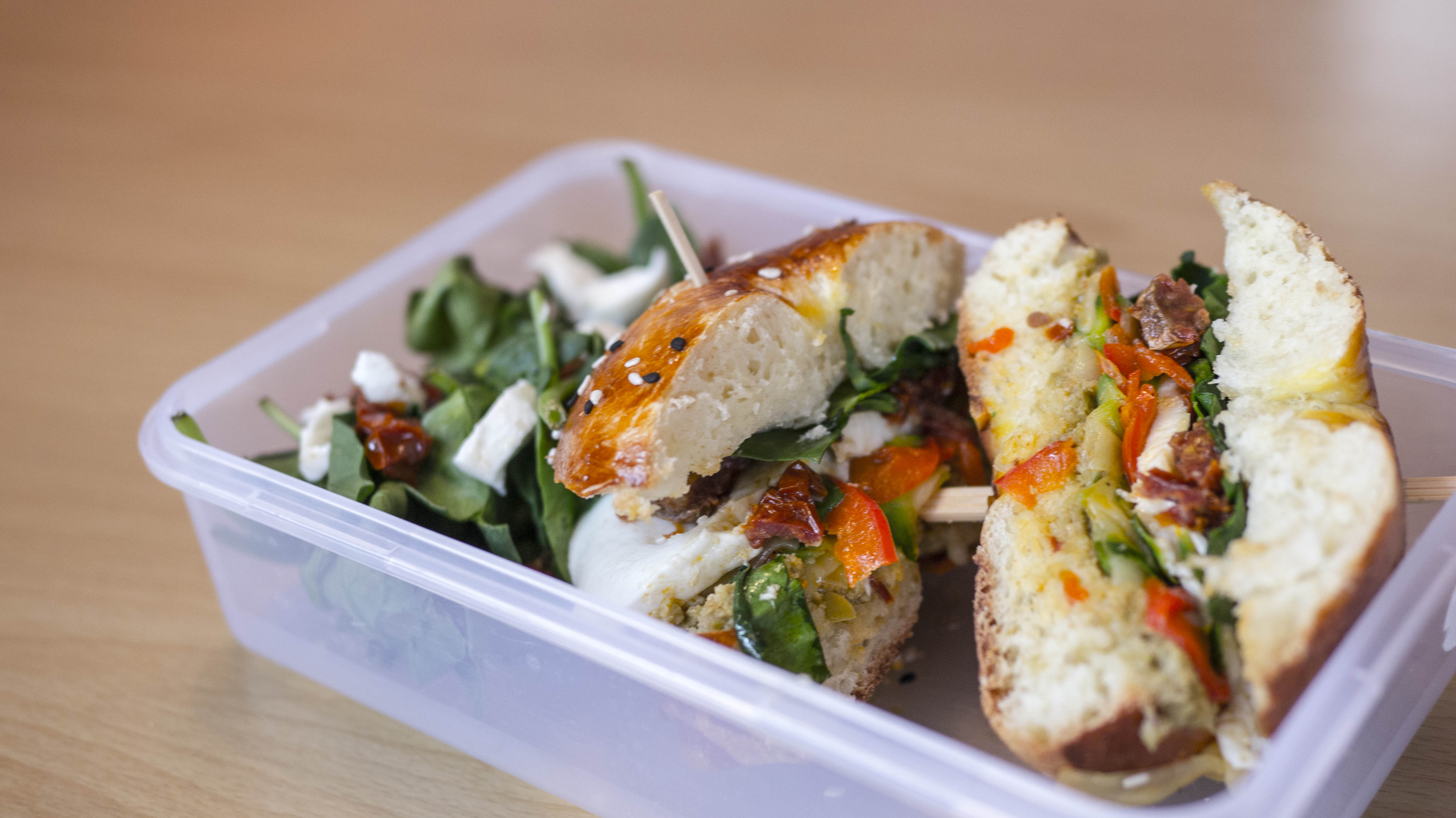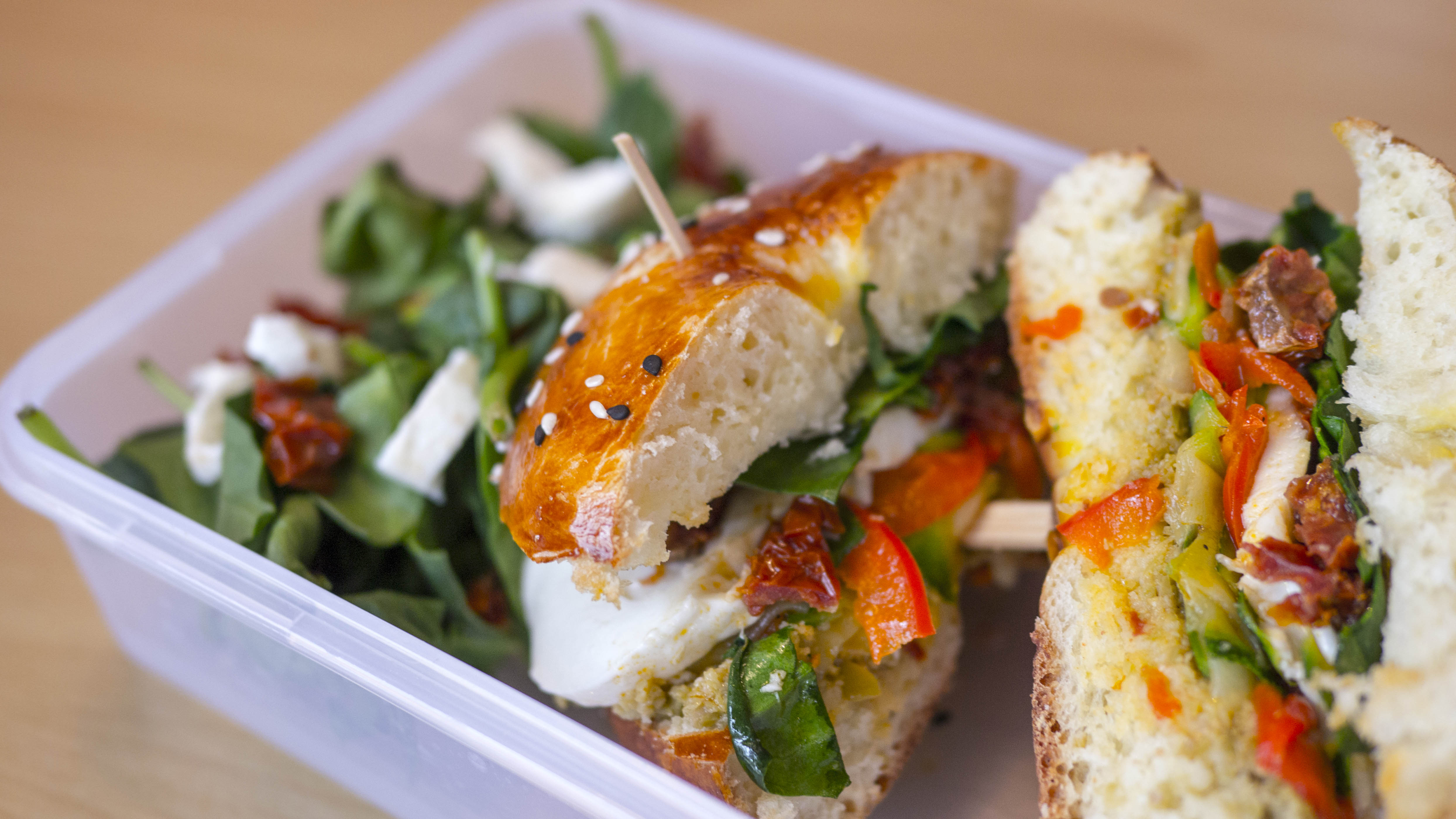 Ajouter les légumes, puis 2 rondelles de mozzarella, les tomates séchées coupées en lamelles puis finir avec quelques pousses d’épinard. Refermer le bagel avec le deuxième pain.